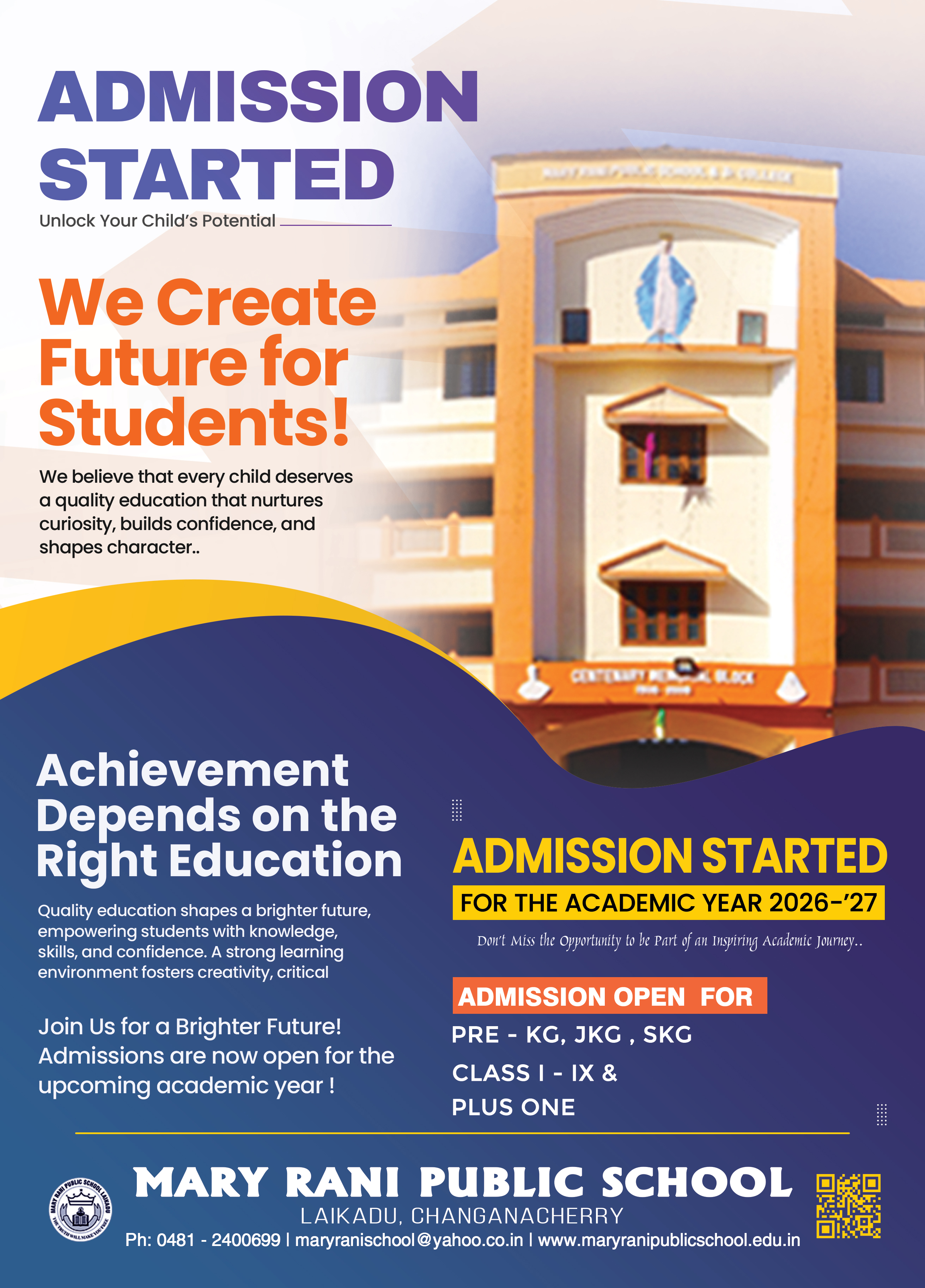 Admission: PRE KG, KG, Std: I- IX & XI are now open. Contact us through phone or may approach the school office directly for registration and admission on all working days between 9.30 am and 3.30 pm.An Aptitude Test will be held for all the students seeking admission to various classes.